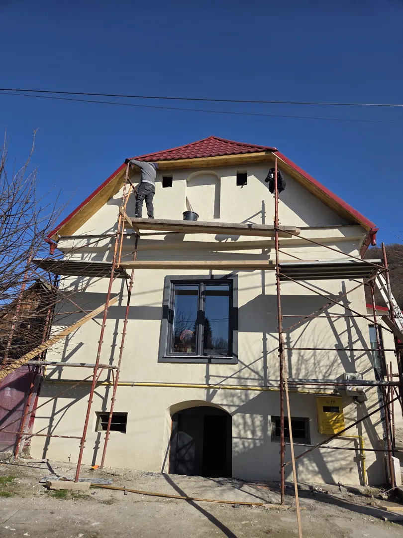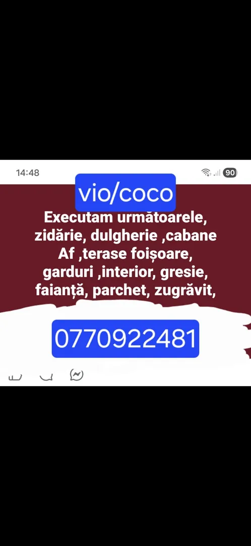 Despre noi: Suntem o echipa de profesioniști și executăm următoarele/zidărie, dulgherie, cabane,Af, terase, foișoare, garduri. Interioare, gresie, faianță parchet, rigips, glet, tencuieli,zugrăveli baghete decorative placări cu polistiren adeziv ,plasa,decorativa,reparații acoperișuri, acoperișuri noi,case la rosu, garaje, pavaje,etc