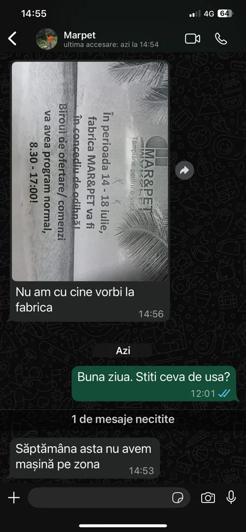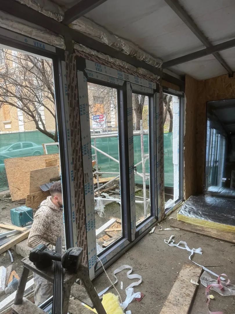 3 bucati ferestre: 1.47/1.32h, cu doua canate, una fixa si una cu deschidere; 2 buc usi de sticla sablata: 0.76/2.0 si 1.0/2.0, pentru exterior.