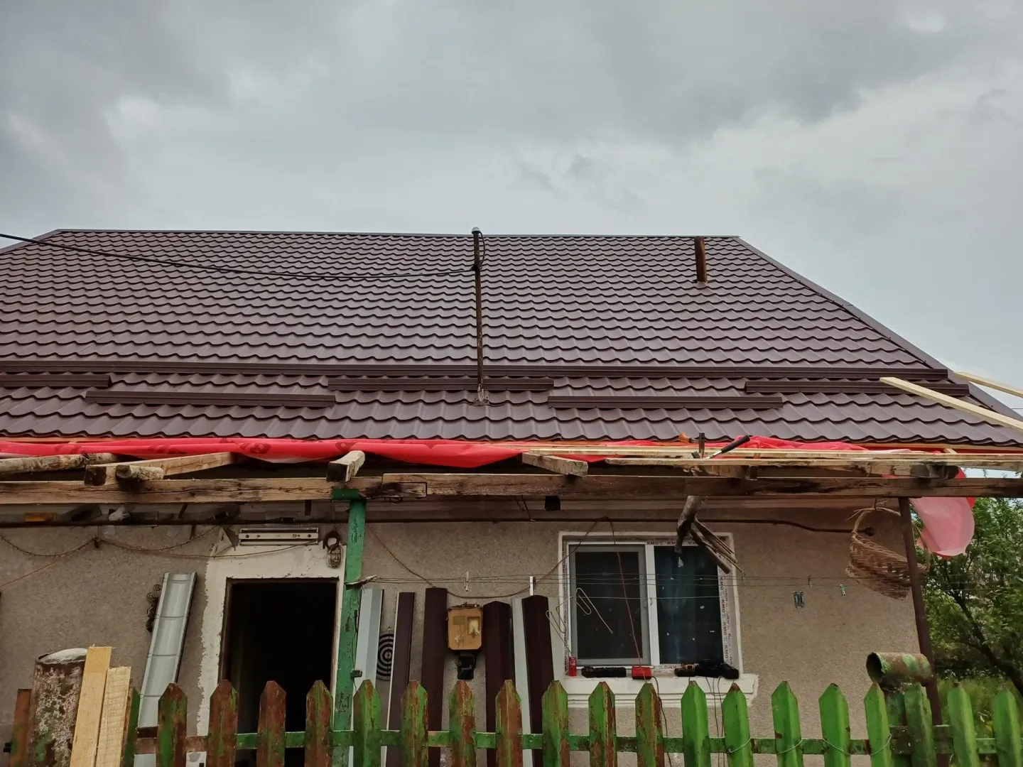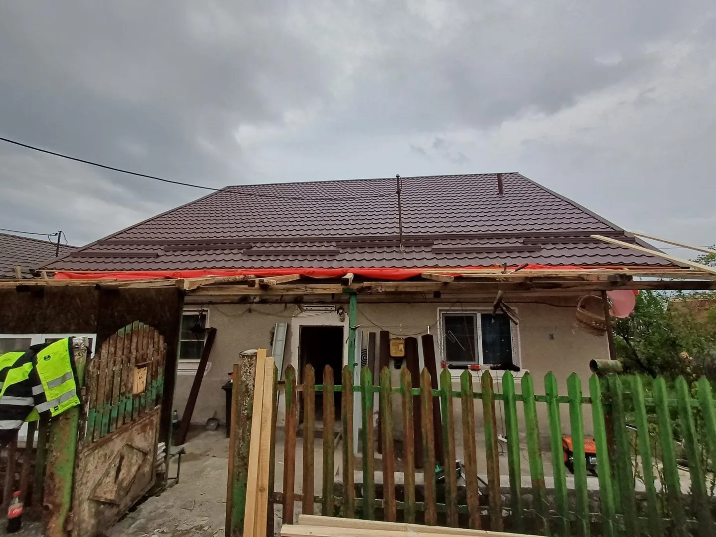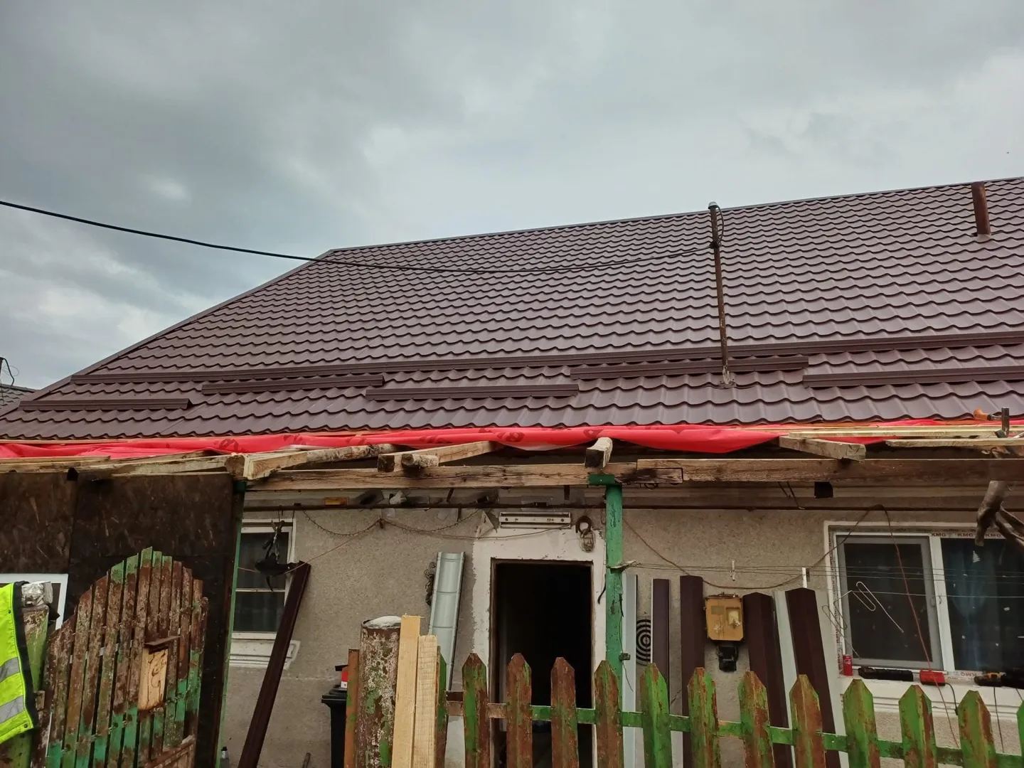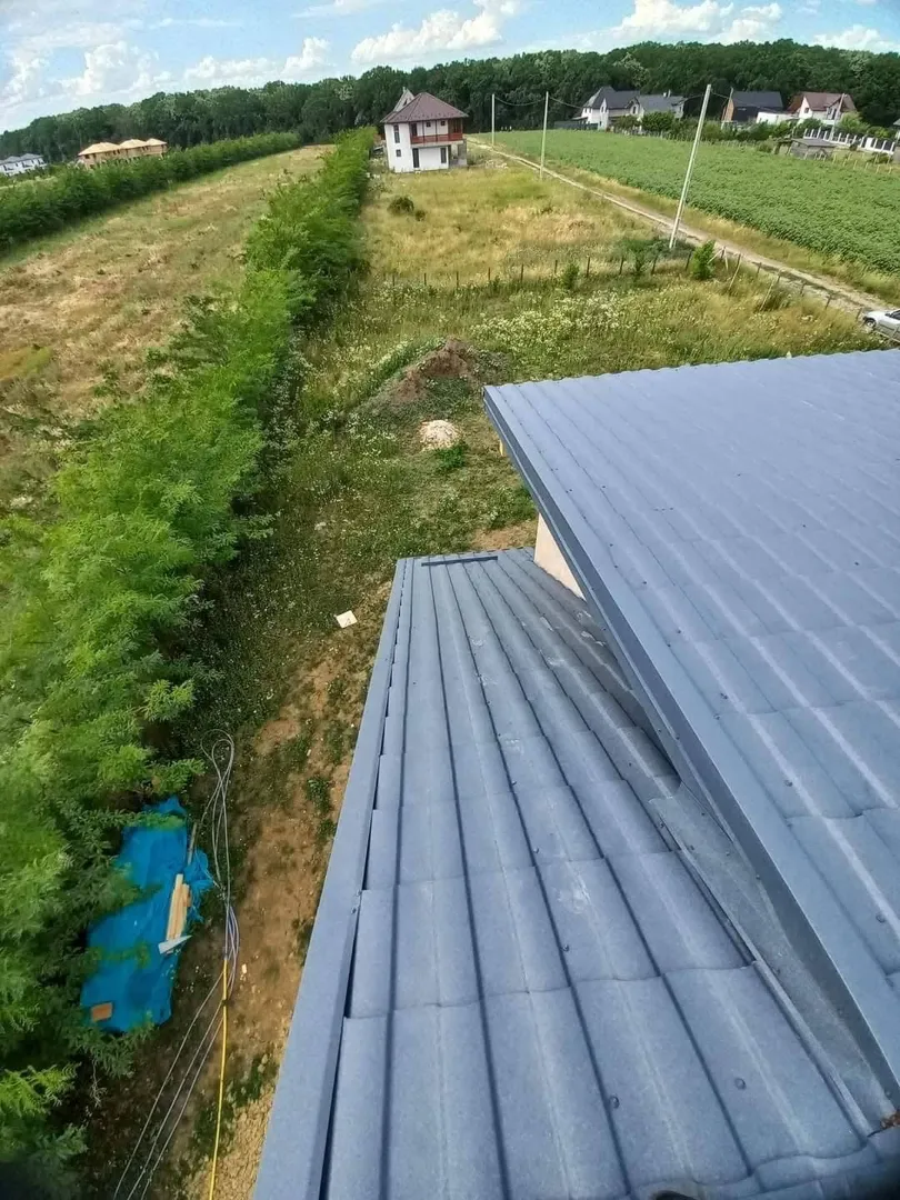 Acoperis cu tigla de 22 ani vechime, mp, in doua ape, cu un atic mic. Trebuie schimbata folia, pus scandura si schimbata tigla.