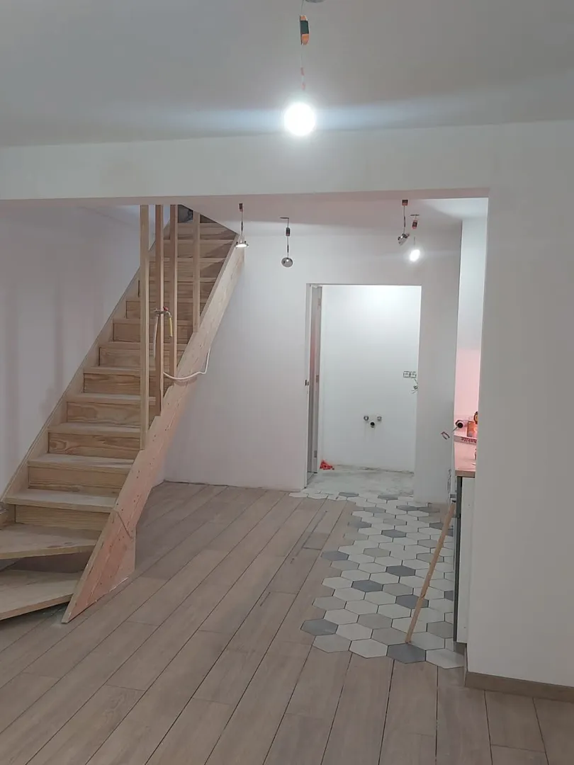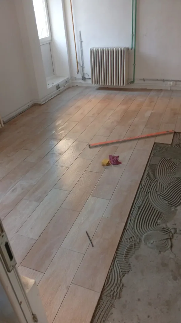 Parchet laminat in sufragerie si dormitor, gresie in bucatarie si hol