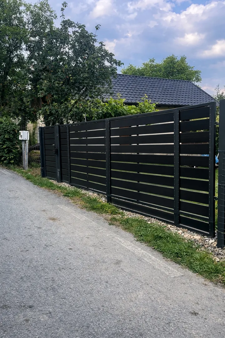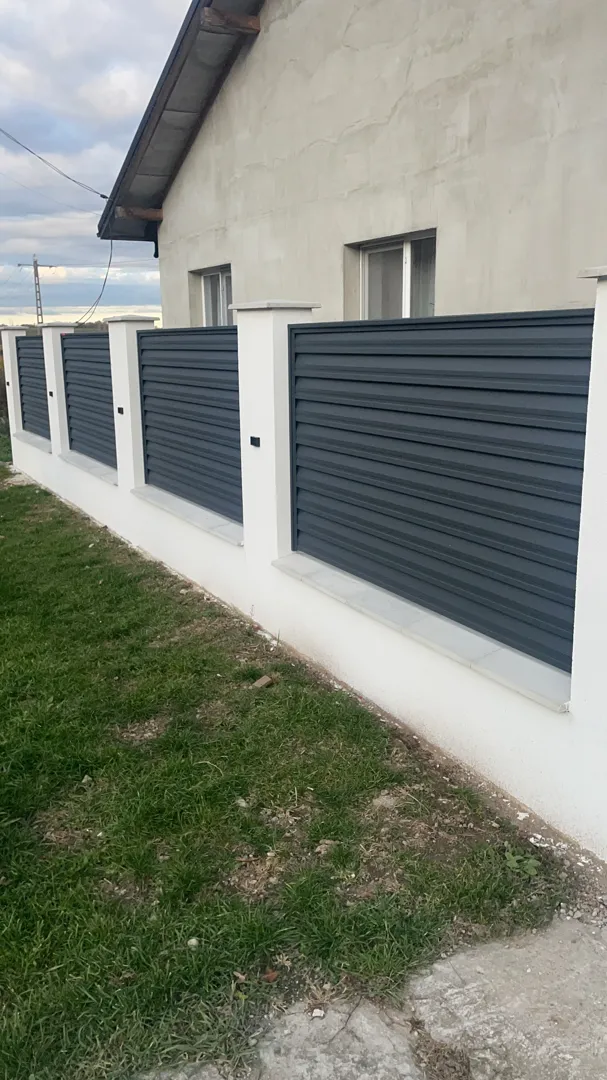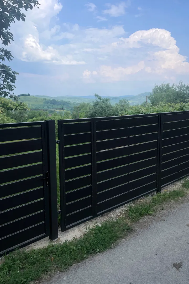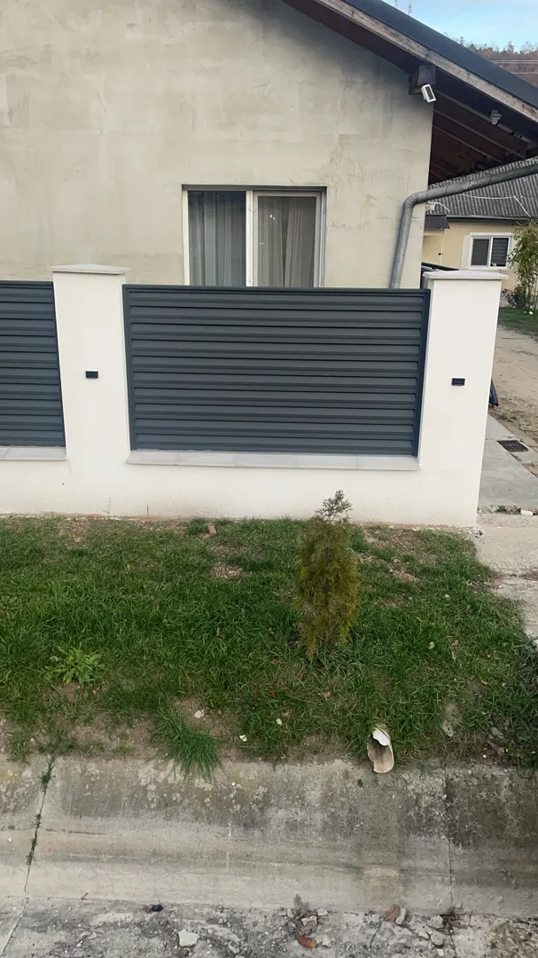 Poarta auto 4m*1,7m , poarta pietonala 1m*1,7m,sipci orizontale stil jaluzea,culoare negru sau gri antracit,cu montaj pe stalpi metalici,toate accesoriile,material,manopera livrare.