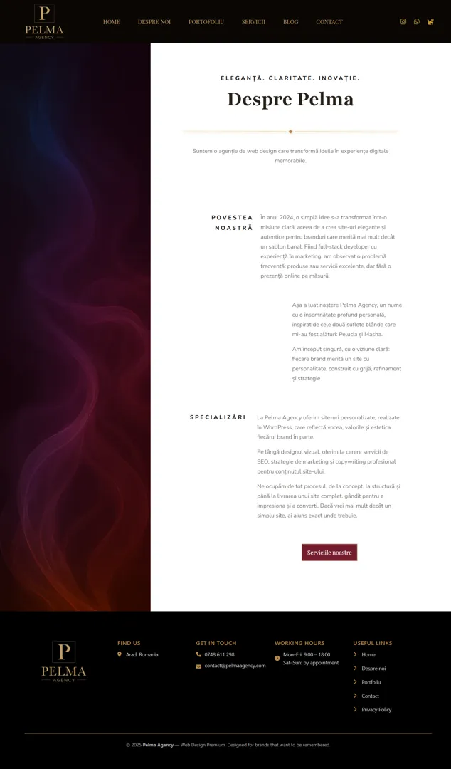 Despre noi: Mă numesc Ioana și lucrez de peste 10 ani în marketing, iar de aproximativ 2 ani activez în IT, cu focus pe realizarea de site-uri WordPress. Abordarea mea pornește de la înțelegerea afacerii, a obiectivelor și a modului în care aceasta comunică, înainte de a construi efectiv un site. Experiența în marketing mă ajută să structurez corect informația, să aliniez site-ul cu brandingul și să creez o experiență clară pentru utilizatori.